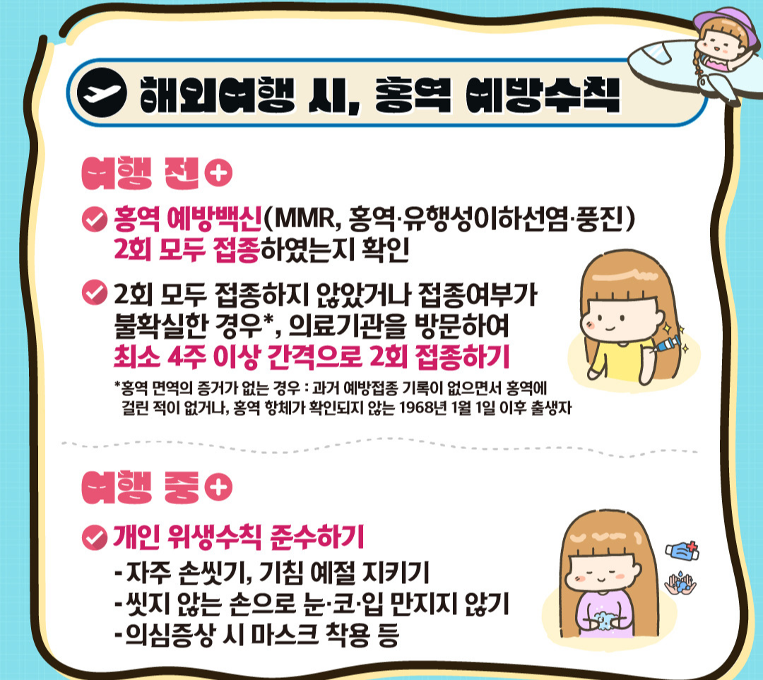 특히 해외여행을 계획하고 있다면, 출발 4-6주 전에 홍역 예방접종(MMR)을 완료하는 것이 좋습니다.
