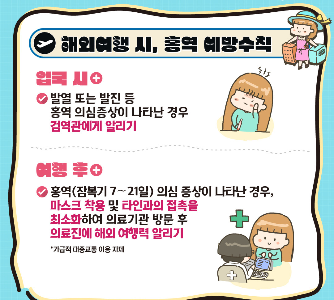 특히 해외여행 중에는 이러한 증상이 발생할 경우, 즉시 질병관리청 콜센터 1399에 신고해야 합니다.